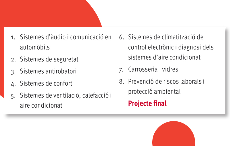 • El llibre consta de vuit unitats didàctiques acompanyades d’un gran nombre de dibuixos, fotografies esquemes elèctrics, a més de Tècniques, Casos pràctics i Activitats, per tal d’exercitar i potenciar els continguts apresos. Totes les unitats finalitzen amb una Autoavaluació, que et permetrà comprovar i consolidar l’aprenentatge.