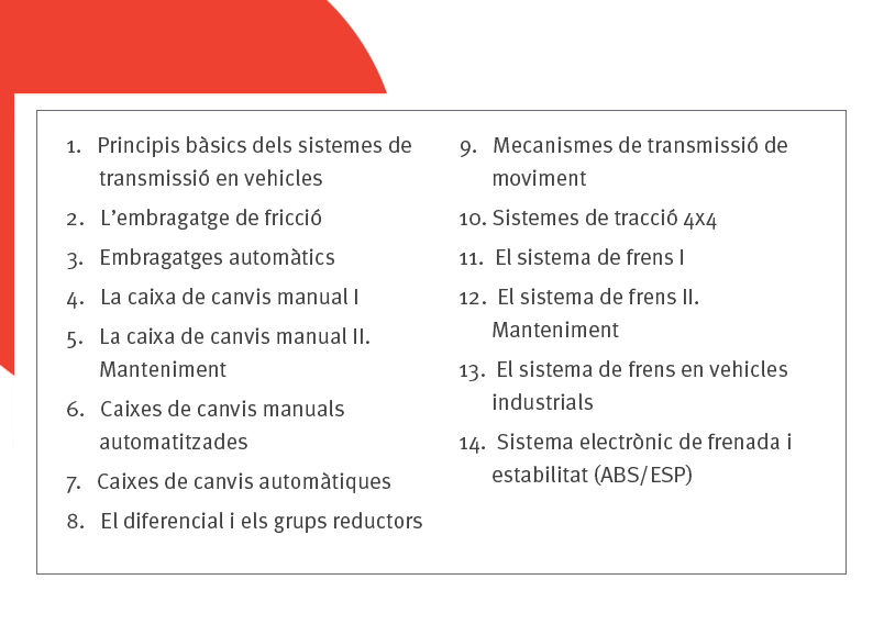 - Aquest llibre desenvolupa de manera teòrica i pràctica els principals elements que realitzen la transmissió de la força i el moviment en els vehicles actuals, així com els diferents sistemes de fre.