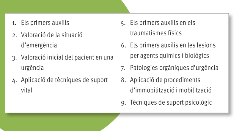 - Aquest llibre aborda, des d’un punt de vista teòric i pràctic, el concepte de primers auxilis, la valoració de les situacions d’emergència i del pacient en una situació d’urgència, l’aplicació de tècniques de suport vital bàsic, les actuacions davant de lesions i en cas de patologies orgàniques d’urgència, les tècniques d’immobilització i mobilització dels pacients i les tècniques de suport psicològic i autocontrol necessàries per a aquestes situacions.