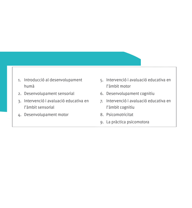 - Els continguts estan estructurats en nou unitats de treball. La primera ofereix una visió general del desenvolupament humà i les vuit unitats restants aborden les diferents àrees en blocs de dues unitats: en la primera unitat de cada un dels blocs s’ofereix una visió més teòrica i en la segona es plantegen la intervenció, les alteracions i l’avaluació.