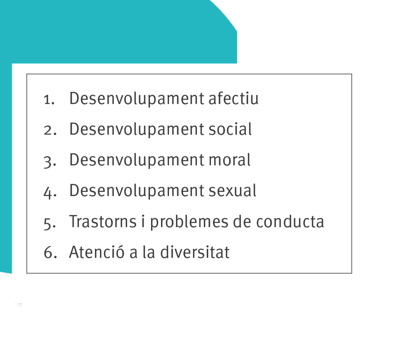 - Els continguts del llibre es desenvolupen en sis unitats didàctiques en què s’ofereix una visió teórica i pràctica dels processos socials i afectius de l’infant, tractant les àrees del desenvolupament moral, la sexualitat i la conducta en què la socialització i l’afectivitat adquireixen un paper determinant. Així mateix, s’aborda la influència que tots aquests processos tenen en l’atenció a la diversitat i les necessitats educatives especials.
