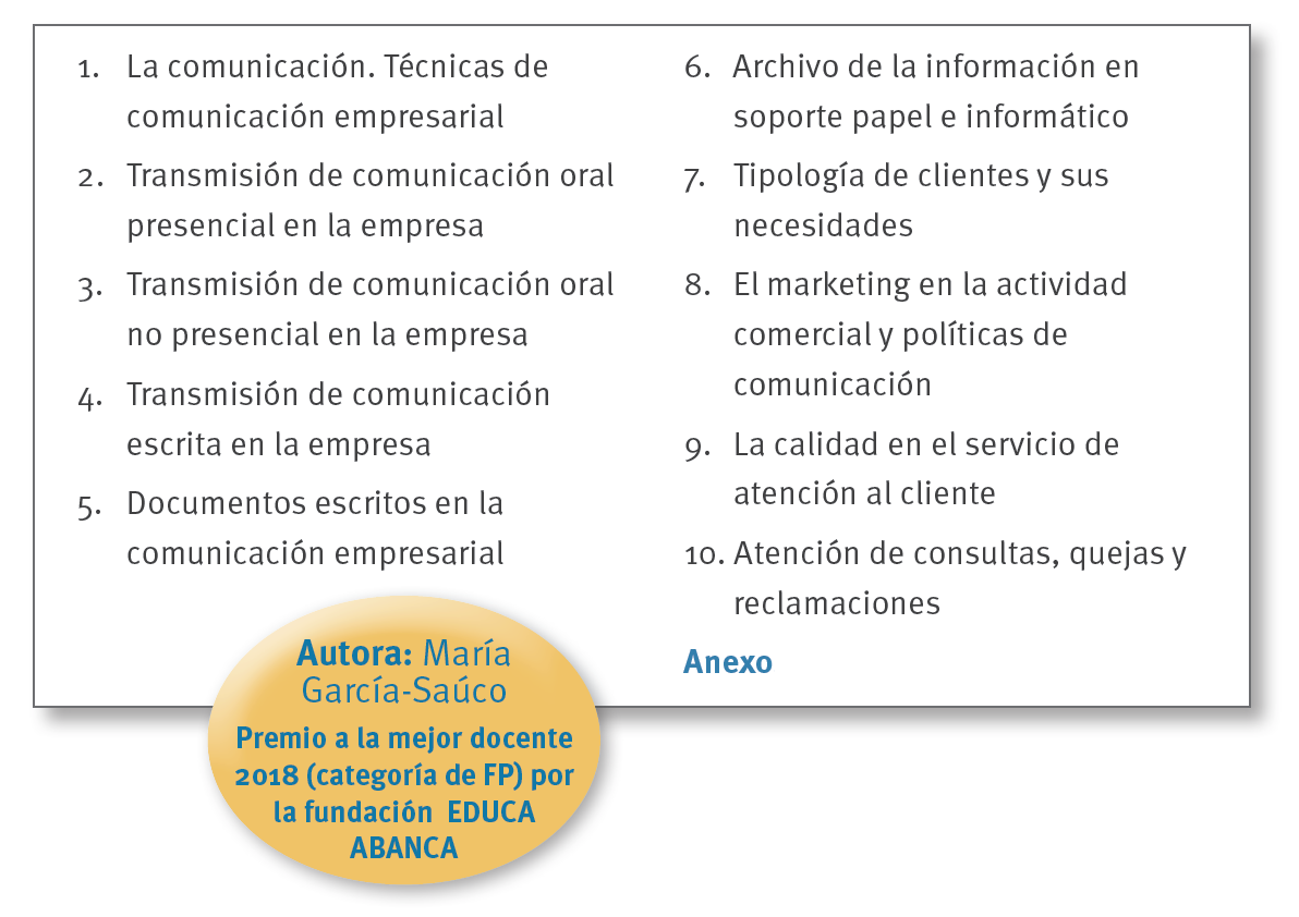 - Todas las unidades avanzan mediante explicaciones teóricas acompañadas de numerosos casos prácticos, ejemplos y actividades. A través de estos se invita al alumno a desarrollar su capacidad investigadora y creativa. El anexo muestra reglas de ortografía básica y abreviaturas, cartas comerciales, etc.