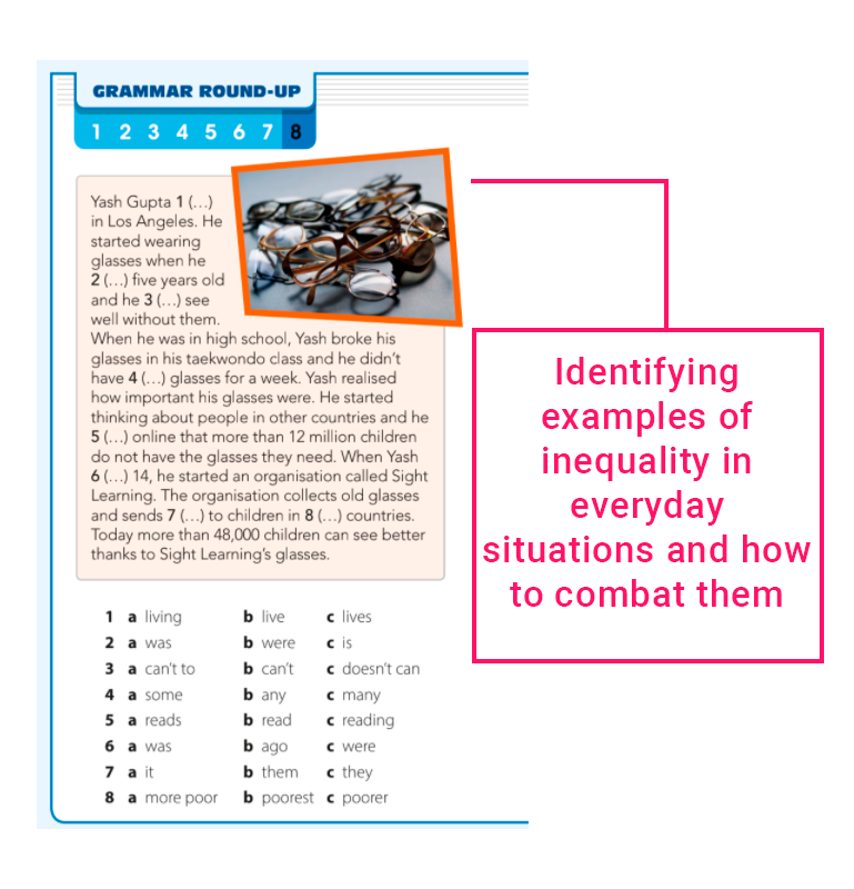In the Secondary English book, Influence 1 page 90, we can see an illustrative example of SDG 10.