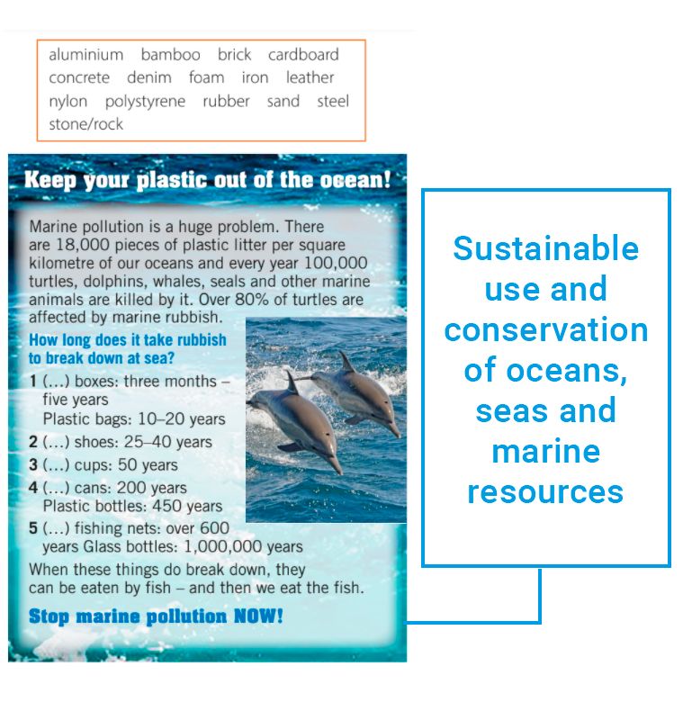 In the Secondary English book, Influence 3_page 65, we can see an example of how to contribute to the achievement of SDG 14.
