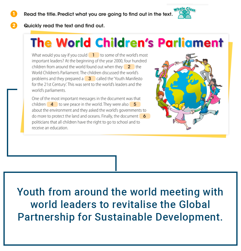 In the Primary English textbook, New High Five 6 page 122, we see an example related to SDG 17.