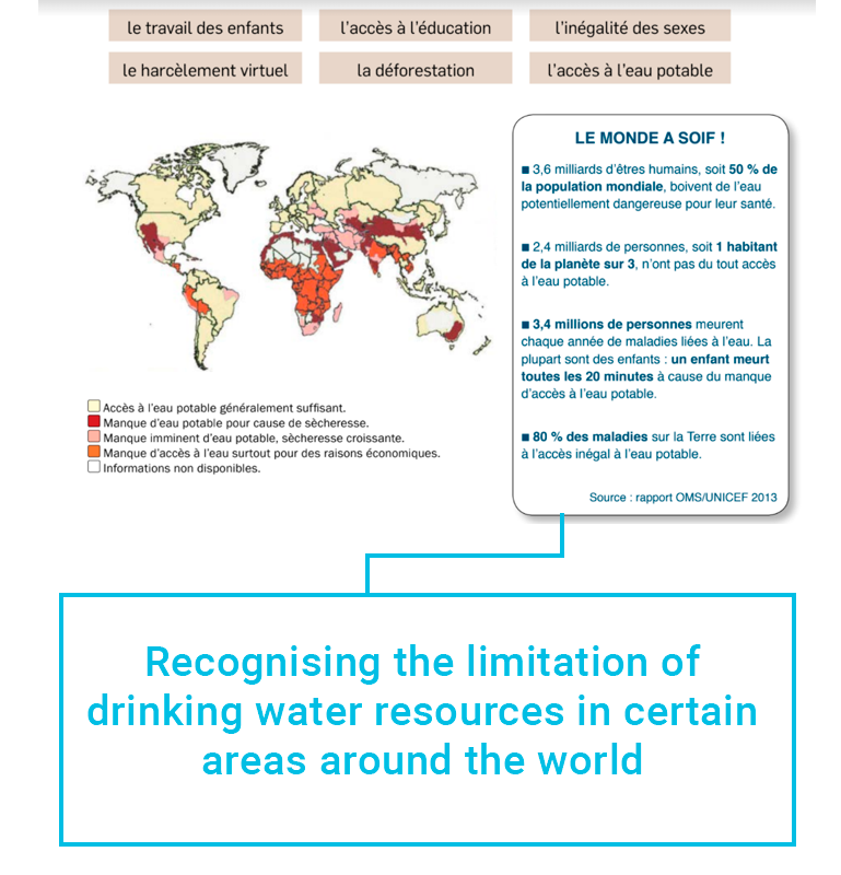 In the French book A Plus 3 page 66, we can see an example of how to become aware of SDG 6.