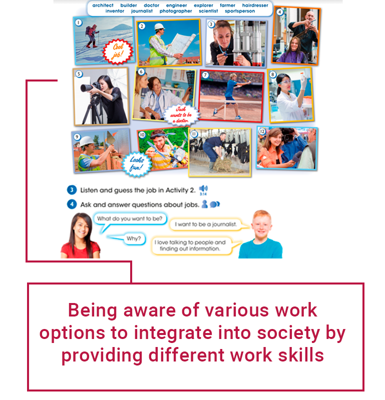 In the Primary English book, Heroes 5 page 48-49, we can see an example of how to identify the actions needed to raise awareness in relation to SDG 8.